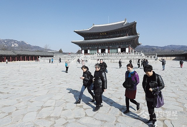 8일 오전 서울 종로구 경복궁을 찾은 중국인 관광객이 이동하고 있다. 중국이 한반도내 사드(THAAD·고고도 미사일 방어체계) 배치에 대한 보복 수위를 높여가고 있는 가운데 고궁을 방문한 중국인 관광객수가 급감한 것으로 나타났다. 문화재청은 3월1∼5일 경복궁, 창덕궁, 덕수궁, 창경궁 등 4대 궁과 종묘의 입장객수를 집계한 결과 중국인 일평균 관람객이 지난달과 비교해 36.5% 감소했다고 이날 밝혔다.