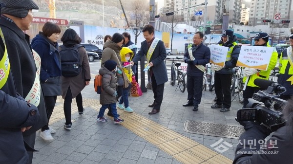지난 7일 서울 은평구는 안전모니터봉사단, 자율방재단 등 민간단체와 구청 직원 40여명이 참여한 가운데 녹번역 3, 4번 출구에서 해빙기 대비 안전사고 예방을 위한 홍보 캠페인을 실시했다. 사진은 신용목 부구청장이 주민에게 홍보물을 전달하는 모습.(사진제공=은평구청)