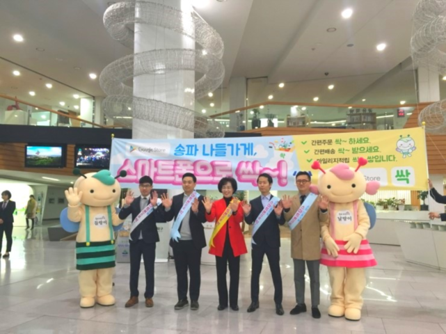 | ▲ 구청 로비에서 박 구청장(가운데)와 직원들이 '싹'어플 홍보를 펼치고 있다.(사진제공=송파구청) | ||