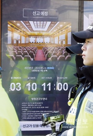 박근혜 대통령 탄핵심판 선고를 하루 앞둔 9일 오전 서울 종로구 재동 헌법재판소에 긴장감이 흐르고 있다.