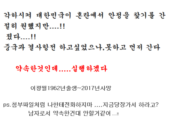 이후 10일 박 대통령의 탄핵이 인용되면서 그는 블로그를 통해 입장을 전했다. 그는 “1962년 출생 ~ 2017년 사망”이라며 “약속한 것인데 실행하겠다 남자로서 약속한건데 안할거 같어”라고 글귀를 적었다.