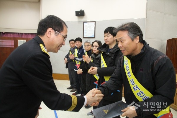 서울 동작소방서는 10일 오후 2시 3층 강당에서 '우리 시장 자율소방대 발대식'과 임명장 수여 행사를 실시했다. 사진은 박찬호 서장(왼쪽)이 시장 상인들과 악수하는 모습.(사진제공=동작소방서)