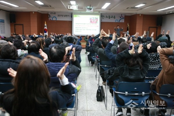 최근 서울 강동구청 대강당에서 상반기 공공일자리 참여자 220명을 대상으로 ‘공공일자리 참여자 안전·노동교육’을 실시했다. 사진은 강사의 지시에 따라 ‘목뒤 박수’를 따라 하고 있는 교육 참가자들의 모습.(사진제공=강동구청)