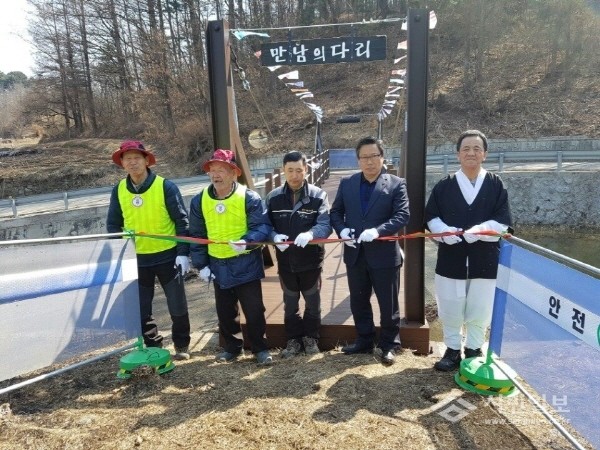 경기 양평군 강상면 병산2리가 지난 11일 마을 내 인도교 설치공사 준공식을 개최했다. 사진은 이장을 비롯한 관계자들이 테이프 커팅을 진행하는 모습.(사진제공=양평군청)