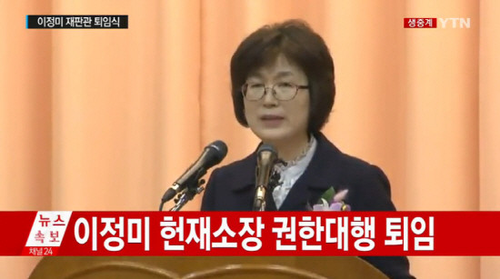 지난 13일 오전 11시 헌재청사 1층 대강당에서는 이정미 권한대행의 퇴임식이 진행됐다. 이날 이정미 권한대행은 퇴임사를 가지면서 “(박근혜 전 대통령 파면) 고통스럽고 어려운 결정이었다”라며 “헌재는 법률에 따라 공정하게 절차를 진행했고 헌법의 정신을 구현해 내기 위해 힘을 다 했다”라고 전했다.