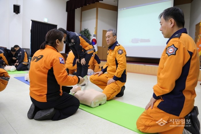 경기 여주소방서는 14일 3층 대회의실에서 소방서 전직원을 대상으로 '심폐소생술 교육 및 제세동기 사용법 전문교육'을 실시했다. 사진은 교육에 참석한 소방서 직원들이 심폐소생술과 제세동기 사용법을 교육받고 있는 모습.(사진제공=여주소방서)