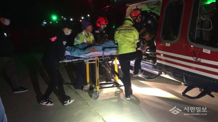 경기 이천소방서는 지난 13일 낮 12시 설봉산에서 실족한 등산객을 소방헬기를 이용해 구조하고, 유리공정 작업 중 부상한 응급환자를 경기도재난안전본부 헬기로 긴급 이송했다. 사진은 소방관들이 응급환자를 헬기에 옮기는 모습.(사진제공=이천소방서)