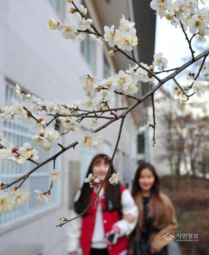 14일 오후 서울 광진구 건국대학교 캠퍼스에 봄을 알리는 매화가 활짝 펴 학생들의 시선을 사로잡고 있다.