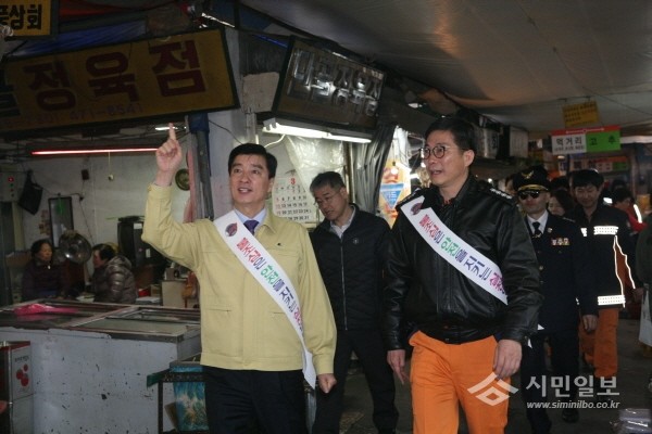 지난 14일 이해식 서울 강동구청장이 천호신시장에서 열린 ‘전통시장 소화기 전달식 및 화재예방 캠페인’에 참석, 동서울시장, 천호시장 등 3곳에 115개의 소화기를 전달하고 화재예방 캠페인을 펼쳤다. 사진은 이 구청장(왼쪽)이 관계자들과 캠페인을 펼치고 있는 모습.(사진제공=강동구청)