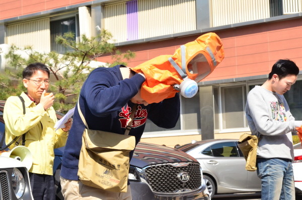 강남소방서는 지난 15일 오후 강남구 보건소 직원들을 대상으로 화재발생시 초기대응 및 대피요령과 화재예방 등의 소방안전교육을 실시했다. 사진은 참여자들이 방독면 착용 실습을 하는 모습.(사진제공=강남소방서)