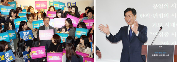 더불어민주당 대선 주자인 문재인 전 대표가 16일 오전 서울 마포구 신한류플러스 프리미엄 라운지에서 ‘전국 지역맘 카페 회원들과의 만남’을 갖고 기념촬영하고 있다(왼쪽). 더불어민주당 대선 주자인 안희정 충남지사가 16일 오전 국회의원회관에서 열린 ‘안희정이 제안하는 시대교체 정책설명회’에 참석, 환하게 웃고 있다.