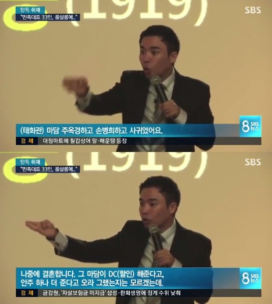 설민석은 최근 진행된 강의에서 "민족대표 33인이 독립선언서를 낭독한 장소는 당시 우리나라 최초의 룸살롱이라 할 수 있는 태화관이었다. 거기 모여 대낮부터 술을 마시기 시작한 거다"라고 했다. 또 "그들이 태화관에 모인 이유는 그곳의 마담인 주옥경과 손병희가 내연 관계였기 때문"이라고 주장했다.