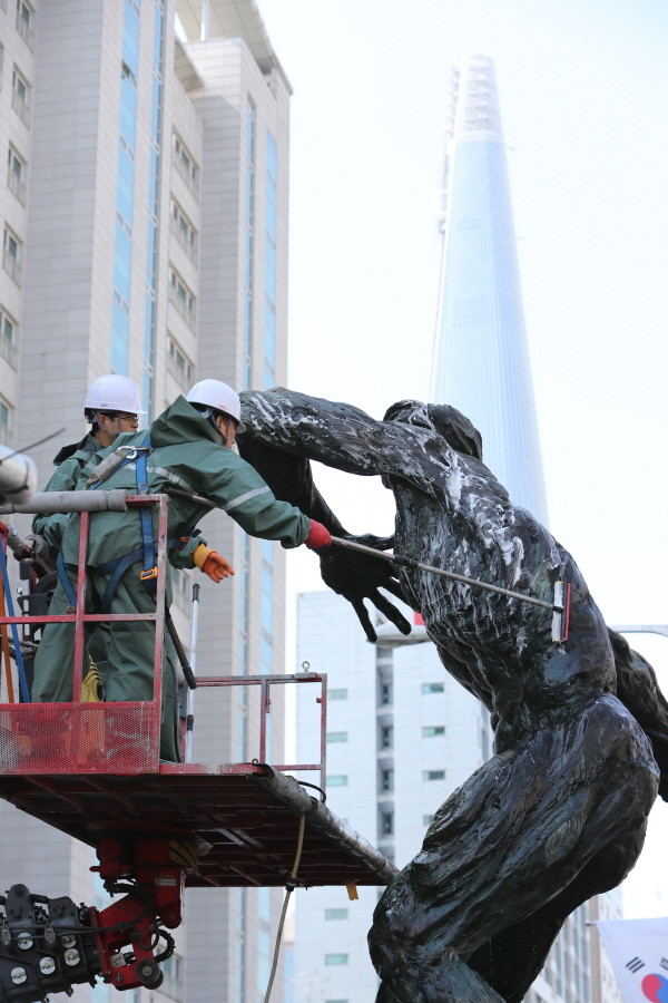 최근 서울 송파구가 다가오는 봄을 맞아 올림픽공원 일대 조형물 세척작업을 실시했다. 사진은 구청직원들이 평화의 문 광장 맞은편 중앙분리대에 설치된 ‘원반던지기 상’ 조형물을 세척하고 있는 모습.(사진제공=송파구청)