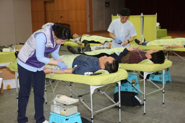 서울 금천구는 지난 17일 오전 9시30분 구청 12층 대강당에서 대한적십자사 서울남부혈액원과 공동으로 ‘사랑의 헌혈 운동’을 진행했다. 사진은 차성수 구청장(왼쪽)이 헌혈하고 있는 모습.(사진제공=금천구청)