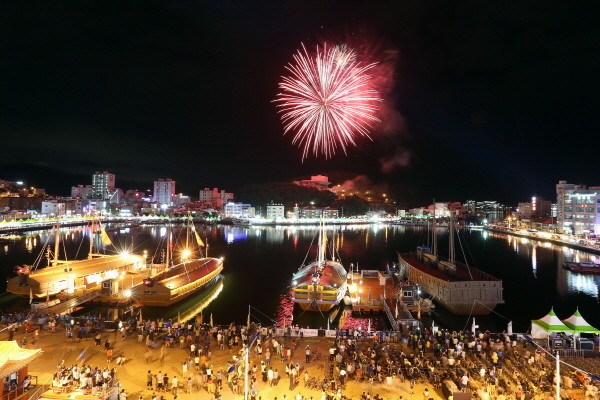 | ▲ 한산대첩을 승리로 이끈 이충무공의 구국정신을 기리며, 한산대첩을 기념하기위해 열리는 통영한산대첩 축제. 관광객들이 화려하게 하늘을 수놓고 있는 불꽃놀이와 웅장한 자태를 뽐내고 있는 선박을 보고있다. | ||