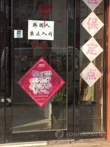 | ▲ 지난 19일 중국 랴오닝(遼寧)성 선양(瀋陽) 선베이신(瀋北新) 구 후쓰타이(虎四臺) 한 약국에 '한국인의 출입을 금한다'는 팻말이 붙은 모습.(사진제공=연합뉴스) | ||