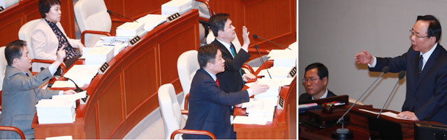 20일 오전 국회 예결위회의장에서 열린 20일 열린 헌법개정특별위원회 전체회의에서 더불어민주당 김종민(왼쪽 사진 오른쪽 위부터 시계방향으로)·최인호·김경협 의원이 민주당을 제외한 3개 교섭단체 원내대표들이 합의한 개헌안에 반발해 의사진행 발언을 요구하며 이주영 특위 위원장(사진 오른쪽)과 설전을 벌이고 있다.