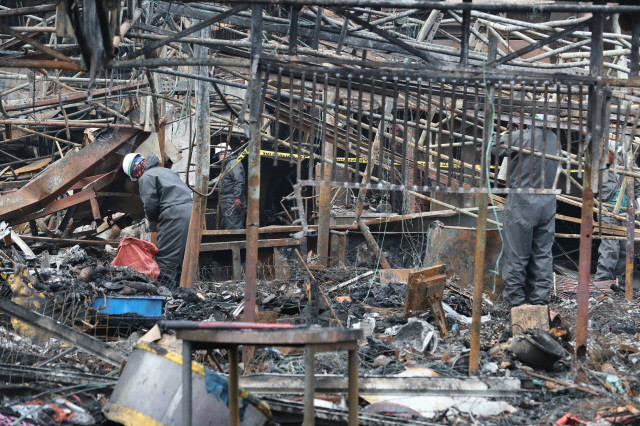 20일 오후 인천시 남동구 소래포구 어시장 화재현장에서 인부들이 전선철거작업을 먼저 하고 있다.