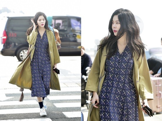 그는 내추럴한 느낌의 오버사이즈 트렌치코트와 슬림한 핏 감의 롱 원피스로 여성스러움을 더한 공항패션을 선보였으며, 여기에 활동성을 고려한 화이트 스니커즈로 자유로운 분위기의 페미닌룩을 완성했다.