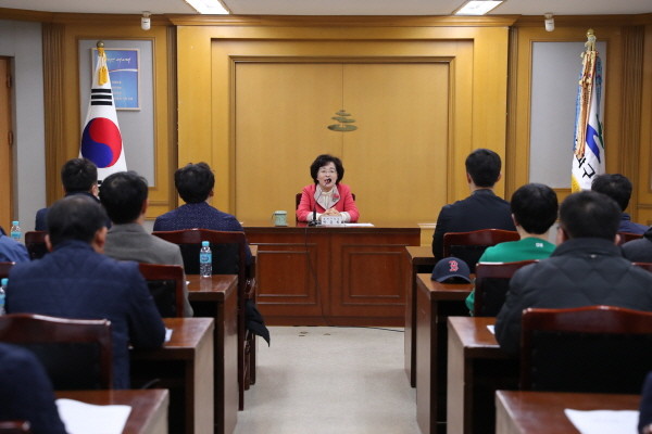 박춘희 송파구청장이 최근 구청 기획상황실에서 열린 ‘건축공사장 안전관리 교육’에 참석해 건축공사장 관계자들에게 공사장 안전에 관한 당부의 말을 전하고 있다.(사진제공=송파구청)