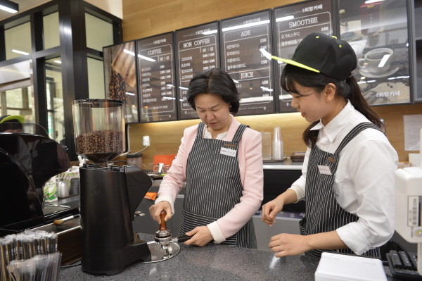 지난 20일 서울 김수영 양천구청장(왼쪽)가 사회적경제지원센터에서 열린 ‘장애인일자리창출 협약식’에서 현대엔지니어링, 희망일굼터와 함께 장애인 일자리 창출 사업 협약을 맺고 센터내에 위치한 ‘희망카페’를 방문했다. 사진은 김 구청장이 근무자와 함께 커피를 만들고 있는 모습.(사진제공=양천구청)