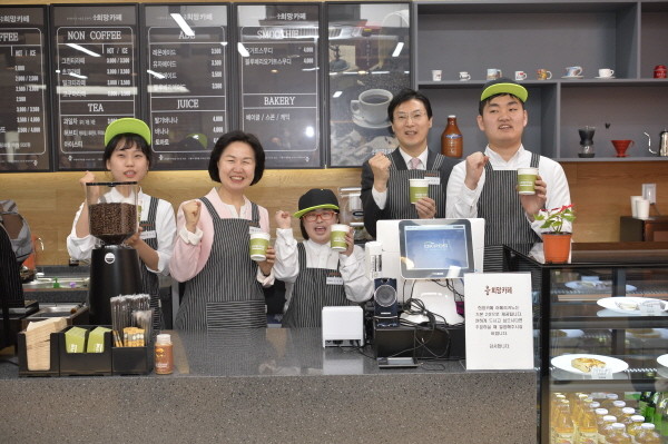 지난 20일 서울 김수영 양천구청장(왼쪽 두 번째)가 사회적경제지원센터에서 열린 ‘장애인일자리창출 협약식’에서 현대엔지니어링, 희망일굼터와 함께 장애인 일자리 창출 사업 협약을 맺고 센터내에 위치한 ‘희망카페’를 방문했다. 사진은 근무자들과 함께 기념촬영을 하고있는 김 구청장의 모습.(사진제공=양천구청)