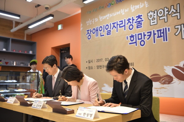 지난 20일 서울 양천구가 사회적경제지원센터에서 열린 ‘장애인일자리창출 협약식’에서 현대엔지니어링, 희망일굼터와 함께 장애인 일자리 창출 지원사업의 협조를 위한 협약을 맺었다. 사진은 김수영 구청장(가운데)이 협약서에 서명을 하고 있는 모습.(사진제공=양천구청)