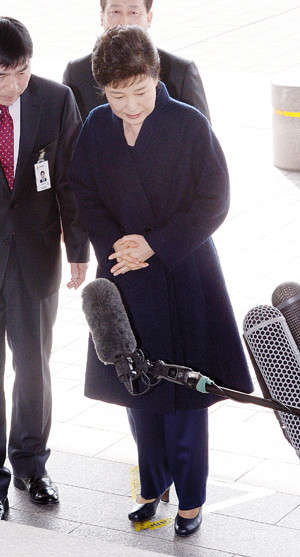 박근혜 전 대통령이 21일 오전 피의자 신분으로 서울 서초구 서울중앙지검에 출석, 포토라인에 서고 있다.