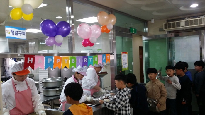 지난 21일 충남 아산시 금곡초등학교에서는 이달 생일을 맞이한 학생들의 생일을 축하하는 ‘생일축하의 날’을 운영했다. 사진은 급식실에서 학생들이 생일 밥상을 제공받는 모습.(사진제공=아신교육지원청)