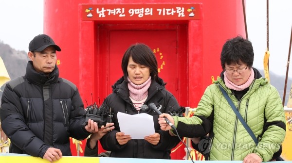 | ▲ 세월호 시험 인양 결정을 앞둔 22일 오전 전남 진도군 팽목항에서 미수습자 가족들이 국민에게 드리는 호소문과 감사인사를 하고 있다.(사진제공=연합뉴스) | ||