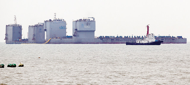 22일 오전 세월호가 침몰한 전남 진도군 동거차도 앞바다에서 인양업체인 상하이셀비지의 잭킹바지선 두 척이 세월호 시험 인양작업을 하고 있다.