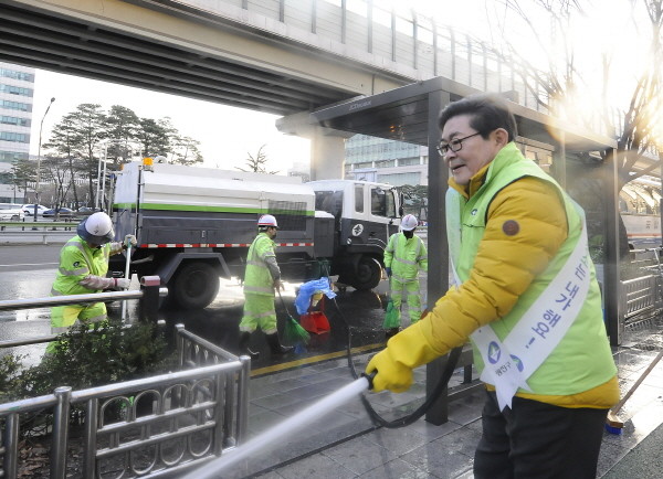 지난 22일 광진구가 새봄을 맞아 주민과 직능단체, 공무원 등 약 1200여명이 참여한 가운데 지역내 도로 위 주요 시설물과 간선도로 및 이면도로 등을 대청소했다. 사진은 김기동 구청장과 환경미화원이 물청소를 하는 모습.(사진제공=광진구청)