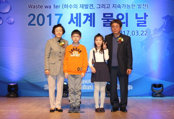 강남구는 지난 22일 오전 강남구민회관에서 '세계 물의 날 기념행사'를 개최했다. 사진은 신연희 구청장(왼쪽)이 환경보전시범학교 어린이들과 함께 기념촬영하는 모습.(사진제공=강남구청)