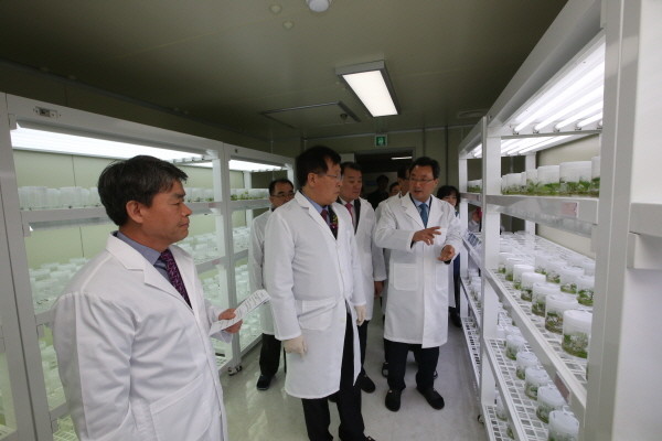 지난 21일 인천 옹진군은 농업기술센터 친환경농업과학관에서 농업인과 내빈 70명이 참석한 가운데 조직배양실 준공식을 개최했다. 사진은 조윤길 군수(가운데)가 관계자에게 조직배양에 관한 설명을 듣는 모습.(사진제공=옹진군청)