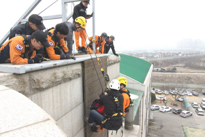 경기 김포소방서는 최근 소방서 3층 옥상에서 안나푸르나 페츨 트레이닝센터 소속 산악·로프 전문가 등이 특별교관으로 참여한 가운데 구조대원을 대상으로 ‘로프활용 구조기법 특별교육·훈련’을 실시했다. 사진은 구조대원들이 훈련 중인 모습.(사진제공=김포소방서)