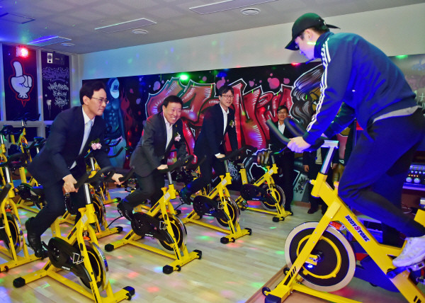 지난 20일 경기 안산시 석수골운동장내 선부다목적체육관에서 선부동 일원 주민과 체육인 등 200여명이 참석한 가운데 ‘선부다목적체육관 준공식’이 열렸다. 사진은 제종길 시장(왼쪽에서 두 번째)이 구 관계자와 함께 운동기구를 체험해보고 있는 모습.(사진제공=안산시청)