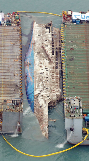 23일 오후 공중에서 촬영한 전남 진도군 사고 해역의 세월호 인양 장면. 세월호 선체는 오후 2시 현재 수면 위 6m까지 들어 올려져 있다.