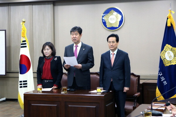 | ▲ (왼쪽부터) 이화묵, 고문식, 정희창 의원이 23일 기자회견에서 입장을 발표하고 있다. | ||
