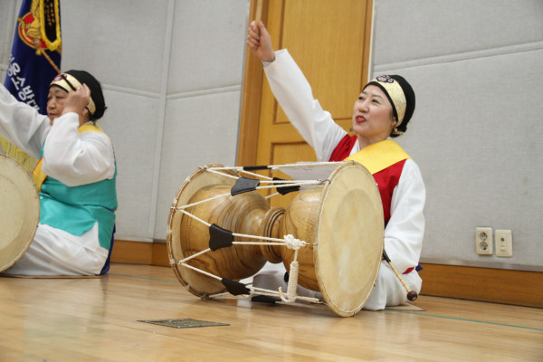 최근 서울 동작소방서는 소방서 3층에서 소방공무원 및 의용소방대원 120명이 참석한 가운데 전국 의용소방대 최초로 ‘풍물놀이패 발대식’을 개최했다. 사진은 의용소방대원들이 풍물놀이를 선보이는 모습.(사진제공=동작소방서)