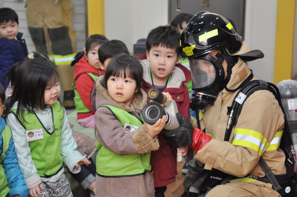 지난 23일 구로소방서는 3층 소방안전체험교실에서 한영어린이집 어린이들에게 '나는야 꼬마소방관'과 '이렇게 대피해요'라는 주제로 소방안전체험교실을 운영했다. 사진은 어린이들이 소방 장비 사용법에 대해 배우는 모습.(사진제공=구로소방서)