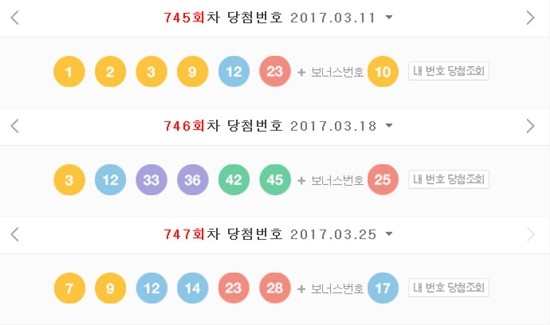 앞서 746회 차 당첨 번호는 3 12 33 36 42 45 25 보너스 번호 25이며 745회 차는 1 2 3 9 12 23 보너스번호 10이다.