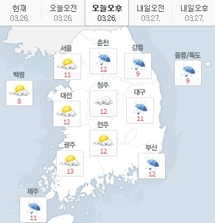 오후에는 서울 11도, 춘천 12도, 대전 12도, 청주 12도, 부산 12도, 제주 11도로 기온이 오른다.