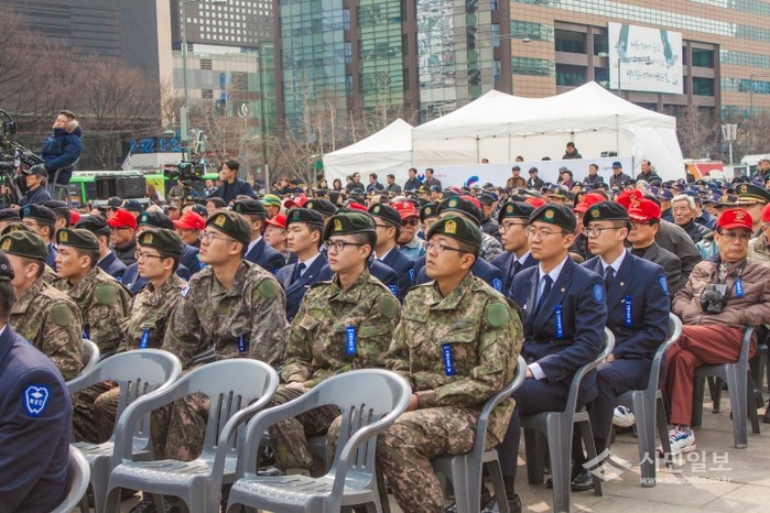 [시민일보=이대우 기자]지난 24일 서울 광화문 중앙 광장서 서울지방보훈청이 개최한 ‘제2회 서해수호의 날 기념식’에서 행사에 참여한 군 장병들이 안보 영상을 보고 있다.