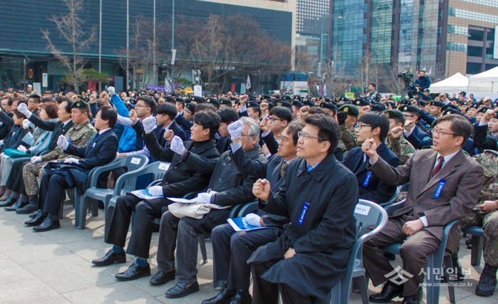 [시민일보=이대우 기자]지난 24일 서울지방보훈청이 서울 광화문 중앙 광장서 전사자 유가족, 주요 인사, 각계 대표, 시민, 학생, 군 장병 등이 참여한 ‘제2회 서해수호의 날 기념식’을 개최했다. 사진은 행사 참가자들이 안보 결의를 다지며 구호를 외치고 있는 모습.
