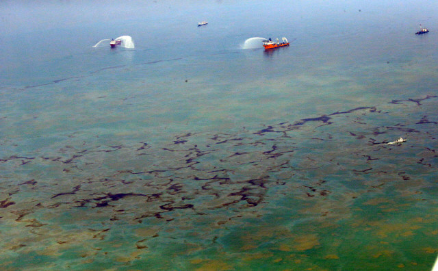 세월호가 26일 오전 반잠수선 갑판에 안정적으로 얹혀진 가운데 인근 해역에 유출된 기름이 떠 있다. 세월호는 2∼4일 정도 배수를 한 후 목포 신항을 향해 '마지막 항해'에 나선다.