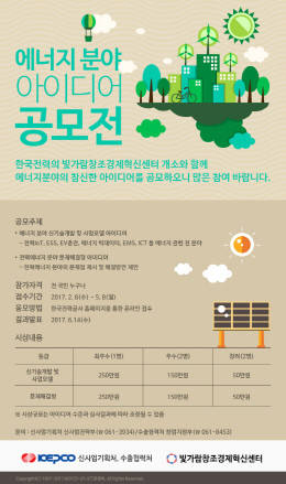공모 주제는 전력IoT, ESS, 전기차(EV), 에너지 빅데이터, 에너지관리시스템(EMS) 등 ‘에너지신산업 분야 신기술 개발과 사업모델에 대한 아이디어’와 ‘전력에너지 분야 문제점 제시와 해결방안을 제안하는 아이디어’ 2가지 분야로 전 국민 누구나 참여 가능하다.