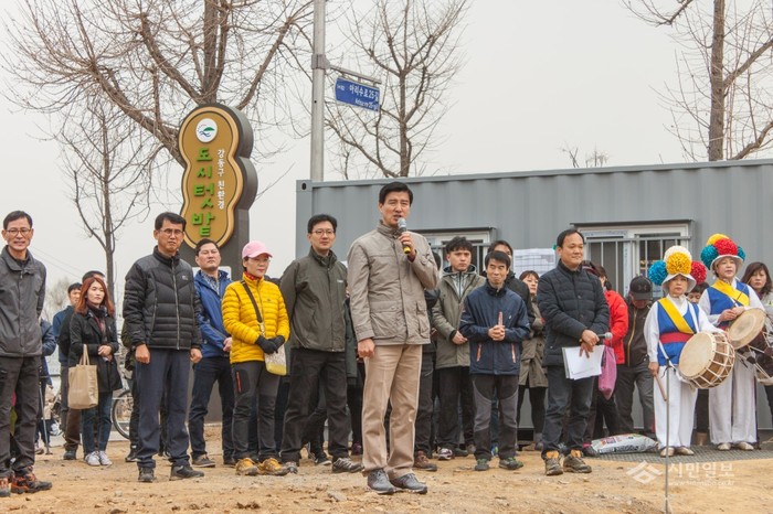[시민일보=이대우 기자]지난 25일 서울 강동구가 양지·암사·둔촌·가래여울·상일·강일텃밭을 동시 개장했다. 사진은 올해 처음 개장한 양지텃밭 개장식에서 이해식 구청장이 인사말을 하고 있는 모습.