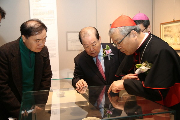 최근 박홍섭 서울 마포구청장(가운데)이 2017 절두산순교성지 축성 봉헌50주년 수집유물 특별전 개막식에 참석해 염수정 추기경(오른쪽)및 관계자들과 함께 유물에 얽힌 내용에 관해 이야기를 나누고 있다.(사진제공=마포구청)