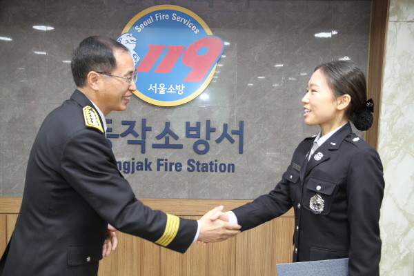 서울 동작소방서는 지난 27일 오전 9시 소회의실에서 제22기 소방간부생(소방위) 김희아 주임에 대한 임용신고식을 개최했다. 사진은 박찬호 서장(왼쪽)과 김 주임이 악수를 하는 모습.(사진제공=동작소방서)