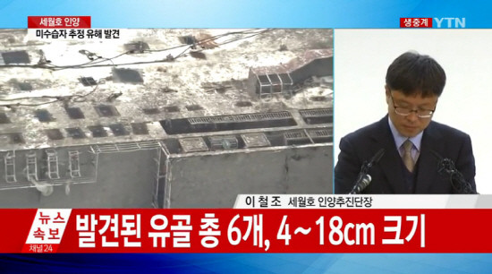 28일 이철조 세월호 인양추진단장은 진도군청에서 브리핑을 진행하며 “유골은 총 6개 4~18cm 크기”라고 전했다. 또한 그는 “유골과 함께 신발 등 유류품도 발견됐다”고 덧붙였다.